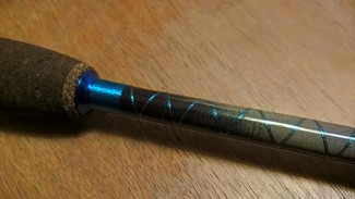 Prezentowany egzemplarz uzbrojony został w dzieloną rekojeść z korka Burnt, uchwyt Fuji TVS oraz komplet przelotek SeaGuide w ramce KL. Całość wykończona aluminiowa biżuterią w kolorze blue, omotka oraz wstawki blue metallic ze srebrnym tipetem.