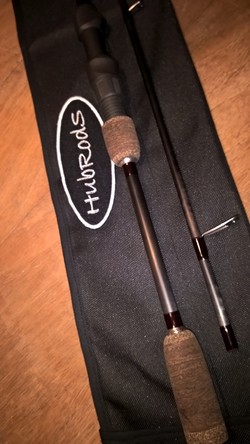 Wędzisko ubrane w komplet przelotek ALPS RS, Fuji SIC na szczycie, rekojeść dzielona z ciemnego tigera, uchwyt SKSS, do tego insert z woven carbonu.