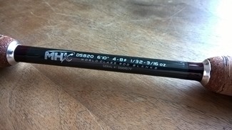 Wędka na blanku MHX DS820, monoblank w długości 2,08m cw 1-6 gram i moc 4-8 lb. Uzbrojona w przelotki Fuji w systemie KrH od 16H po 4KT, uchwyt to Fuji SKSS plus insert z korka, rękojeść dzielona z korka burl tiger oraz burnt plus korkoguma red i black, jako dopełnienie pierścionki aluminiowe.