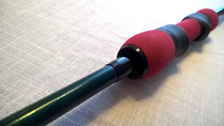 Prezentowany egzemplarz ubrany na według pomysłu klienta dość oryginalnie, dzielona rękojeść z pianki EVA w kolorze czerwonym, do tego uchwyt FUJI KSKSS 17 z piankowym insertem, całość wykończona czarnymi detalami w lakierze. Komplet przelotek Fuji Torizite , omotka czarna z tipetem w kolorze pianki.