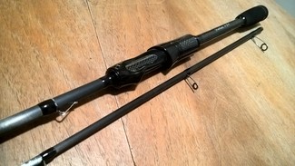Wędzisko ubrane zostało w uchwyt lakierowany uchwyt FUJI TVS, do tego dzielona rękojeść zabudowana woven carbonem, do tego komplet tytanowych przelotek SeaGuide LS, całość utrzymana w czarnych klimatach.