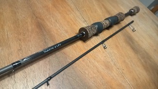 Prezentowany egzemplarz ubrany został w komplet przelotek Fuji Alconite w ramce Frosted Silver, rękojeść dzieloną z korka tiger, oraz uchwyt Fuji SKSS 16. Omotka czarna ze srebrnym tipetem.